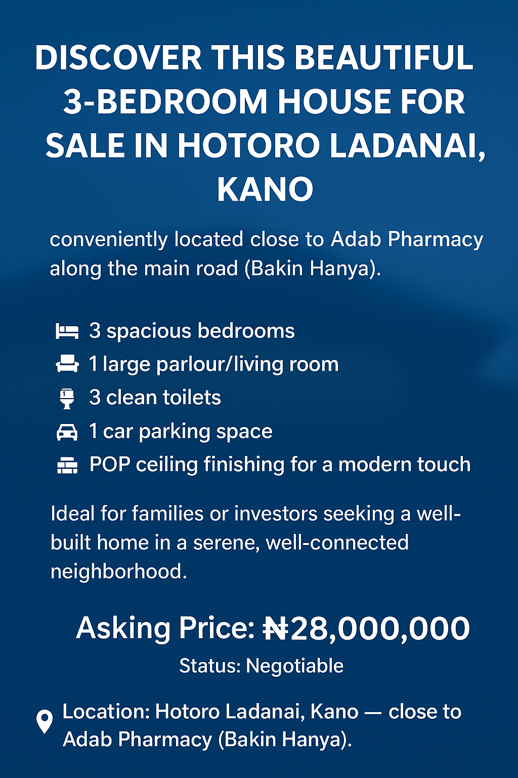 3-Bedroom House for Sale in Hotoro Ladanai, Kano — Prime Location Near Adab Pharmacy