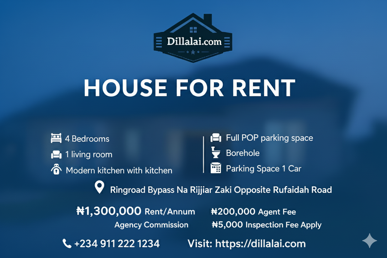 A spacious and well-finished 4-bedroom house is now available for rent at Ring Road Bypass, Na Rijiyar Zaki, directly opposite Rufaidah.